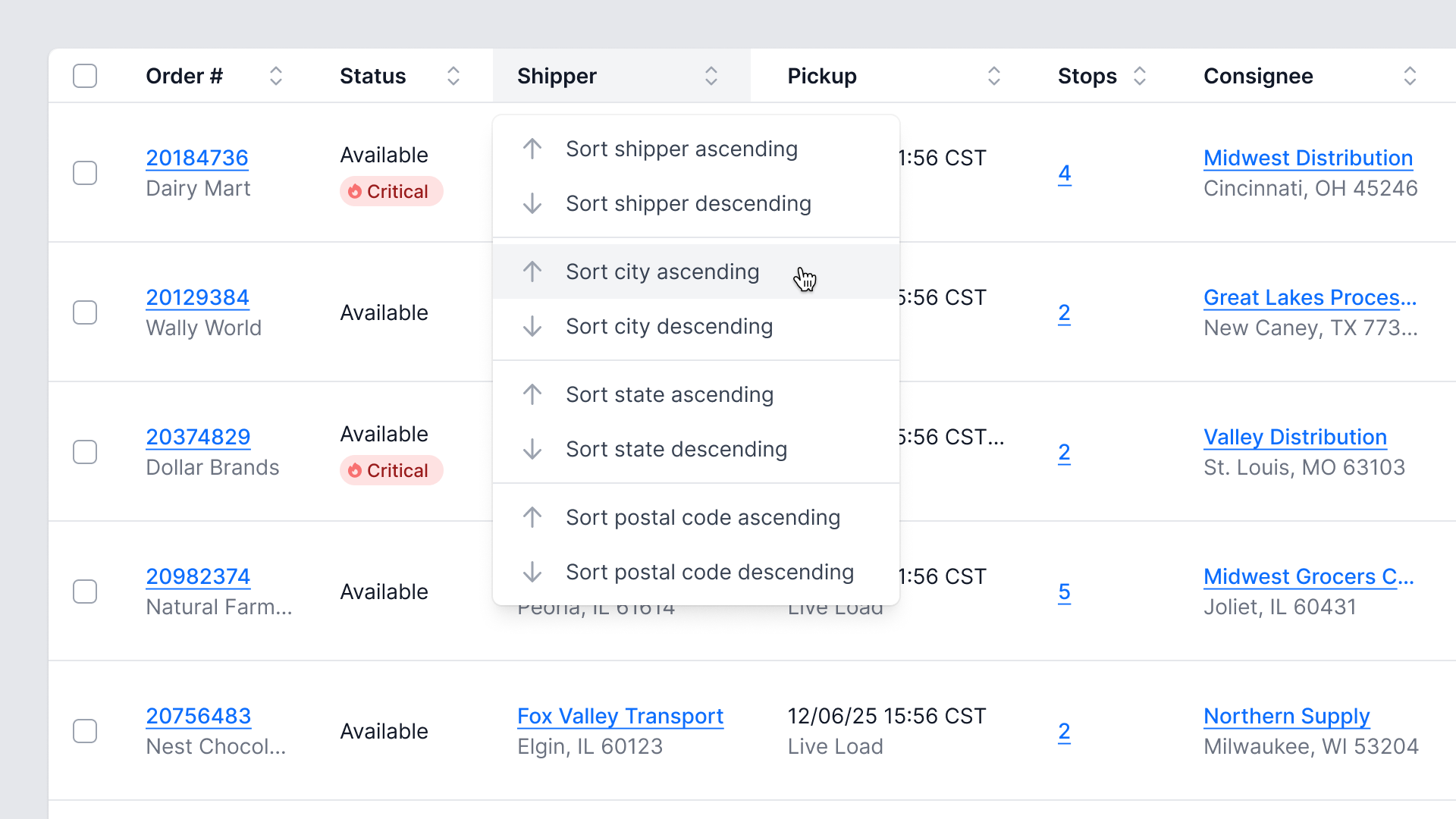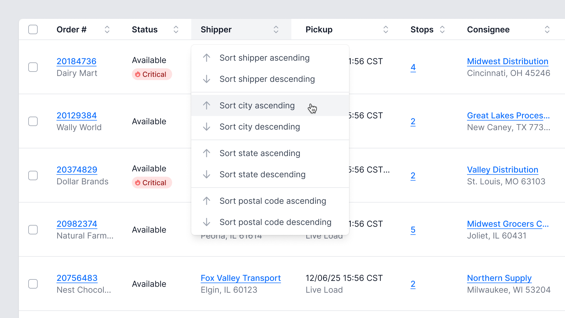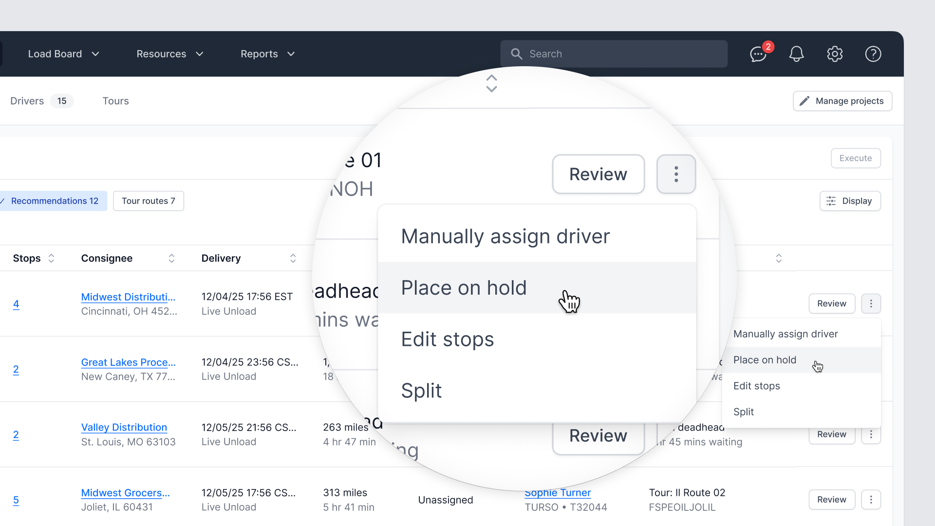 A contextual overflow menu was implemented within each row to maintain a streamlined table view. This mechanism provided access to secondary actions—such as manual driver assignment or load splitting—eliminating the need for users to navigate to a dedicated detail page for execution. This design ensures the primary table remains focused on monitoring and review.