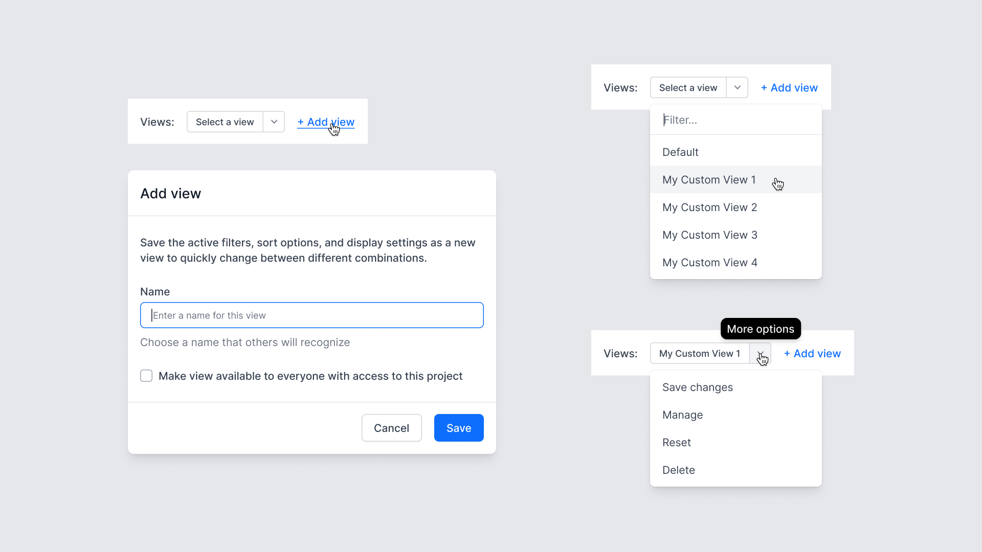 Custom view functionality enabled users to save their entire table state—including active filters, sort options, and column display settings—as a reusable template. This ensured workflow persistence, allowing users to quickly toggle between different configurations.
