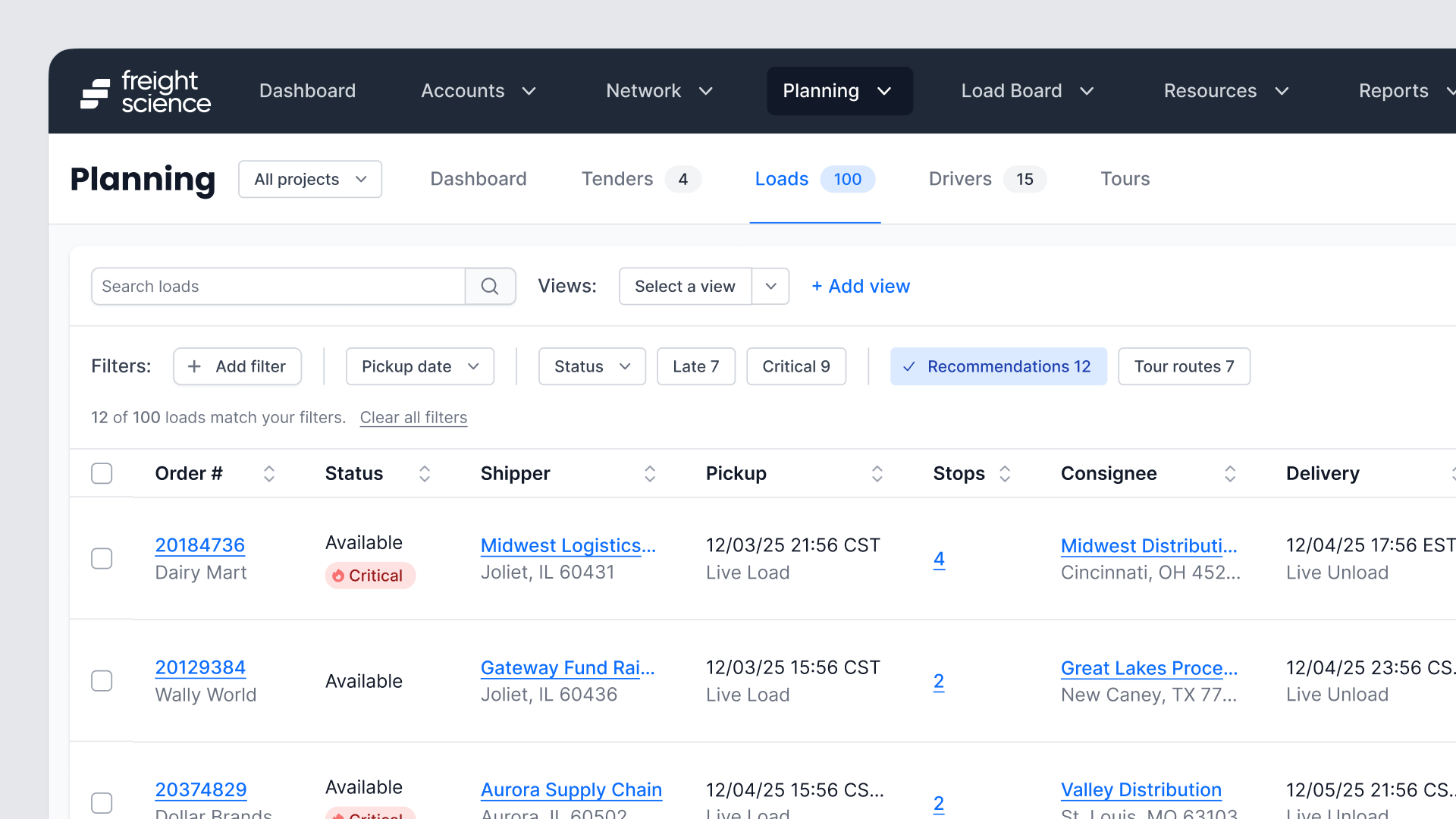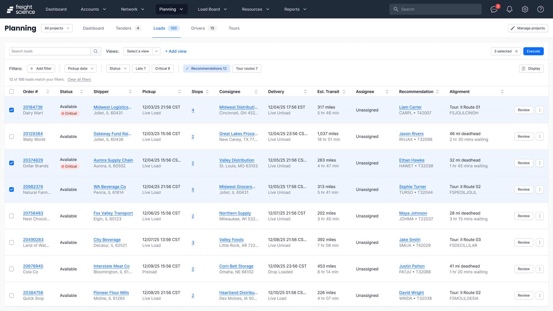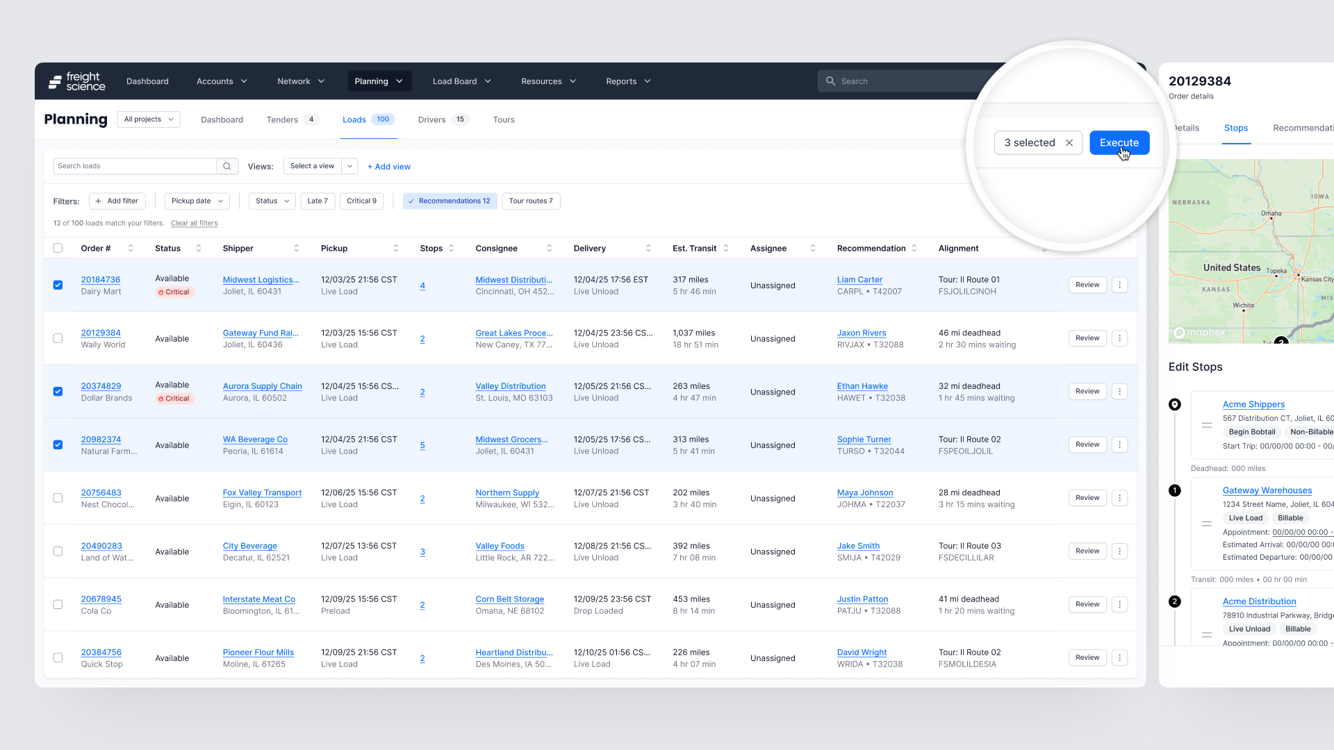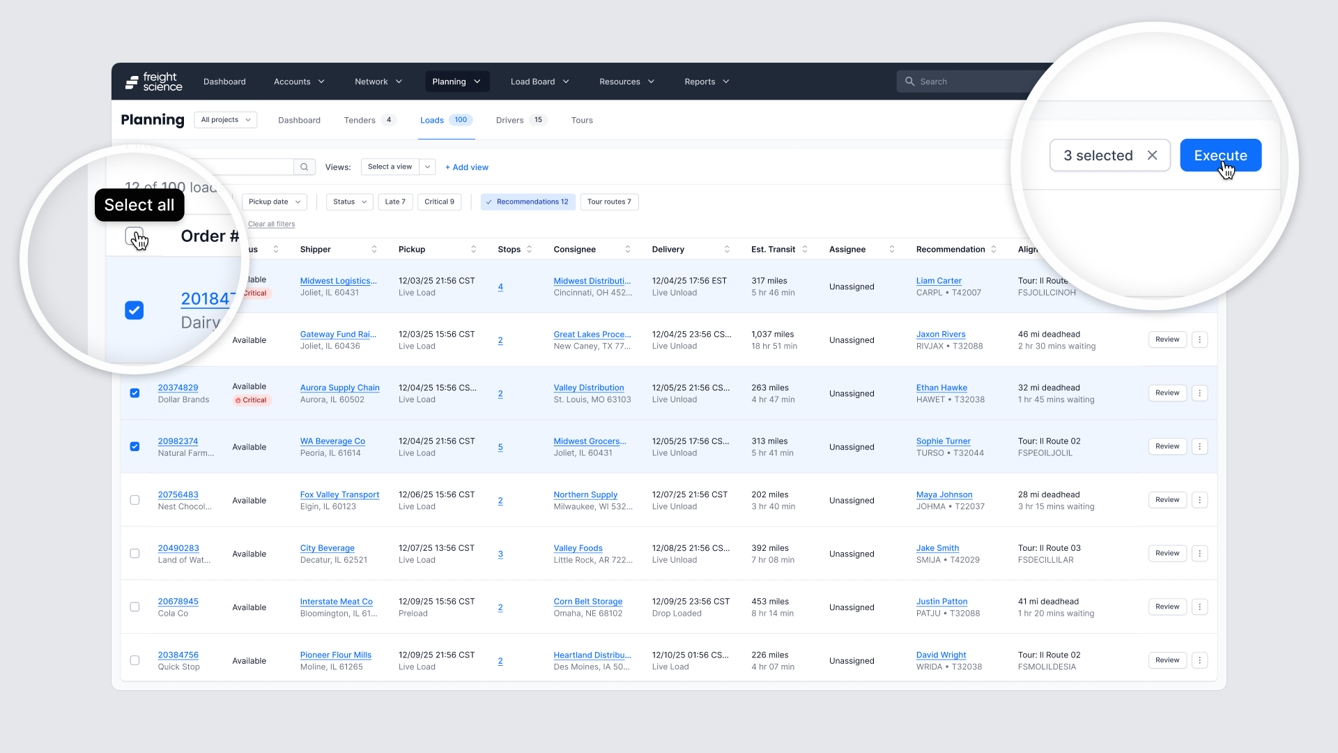Integrated checkboxes and batch execution functionality empowered planners to select multiple recommended loads and assign them simultaneously, immediately reducing the number of clicks. User reports indicated a time savings of up to 66% compared to traditional planning workflows.