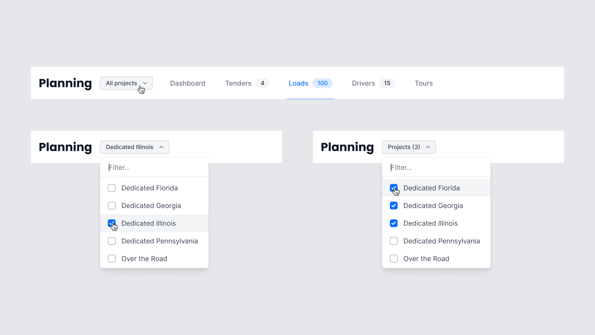 The implementation of a multi-select dropdown facilitated immediate cross-project visibility. This allowed planners to combine data and resources from multiple projects into one unified table, directly reducing operational friction and eliminating the need for constant context switching.