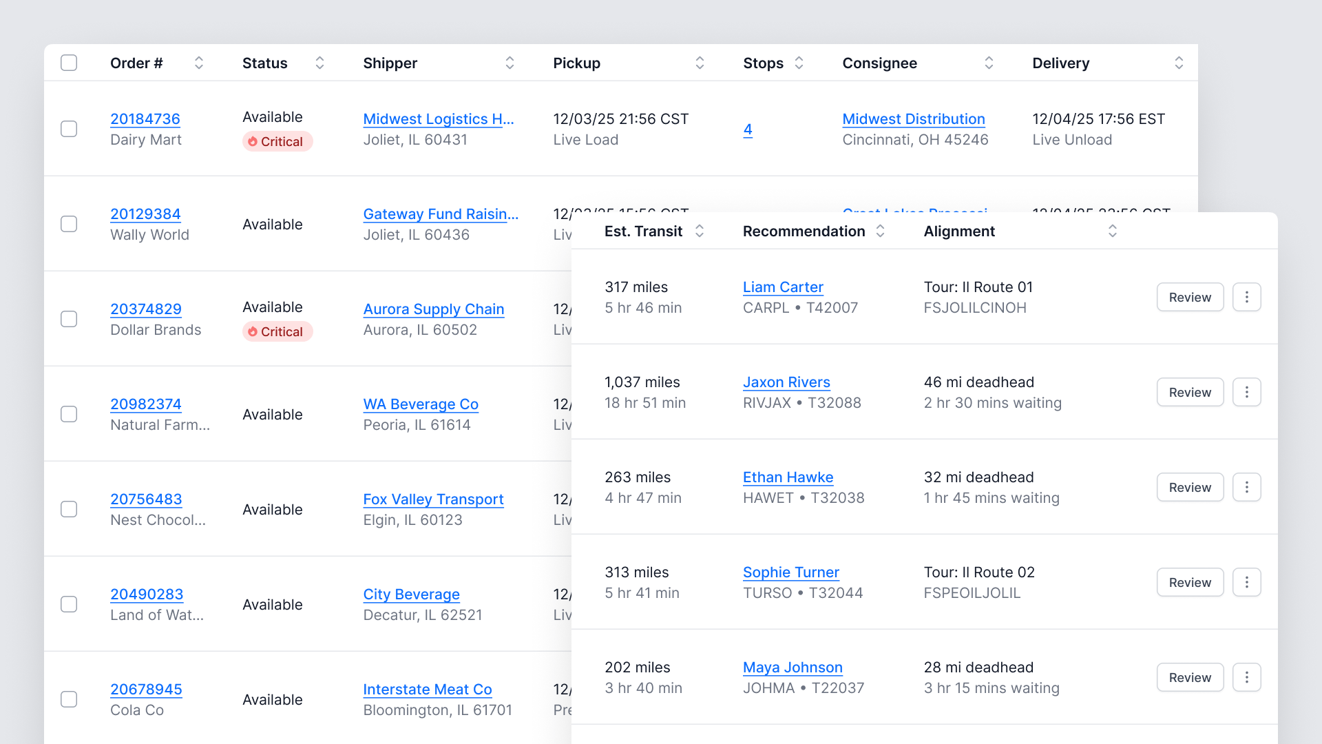 The redesign replaced the card-based view with a consolidated, scalable table structure. This maximized screen real estate, enabling planners to view more entries while surfacing all essential data. The new design eliminated friction points, such as reliance on inefficient hover states and ambiguous icons. Top driver recommendations were integrated directly into each row, accelerating the assignment process.
