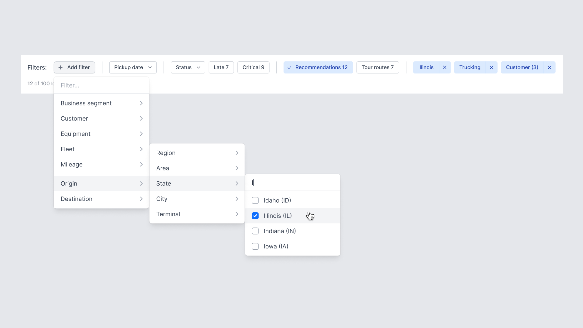 A flexible filtering system provided users with immediate access to common selections, such as pickup date, status, and recommendations, via dedicated Quick Filters. The horizontal structure minimizes screen consumption while supporting complex filtering, allowing users to add advanced filters and quickly narrow down content without sacrificing valuable workspace.