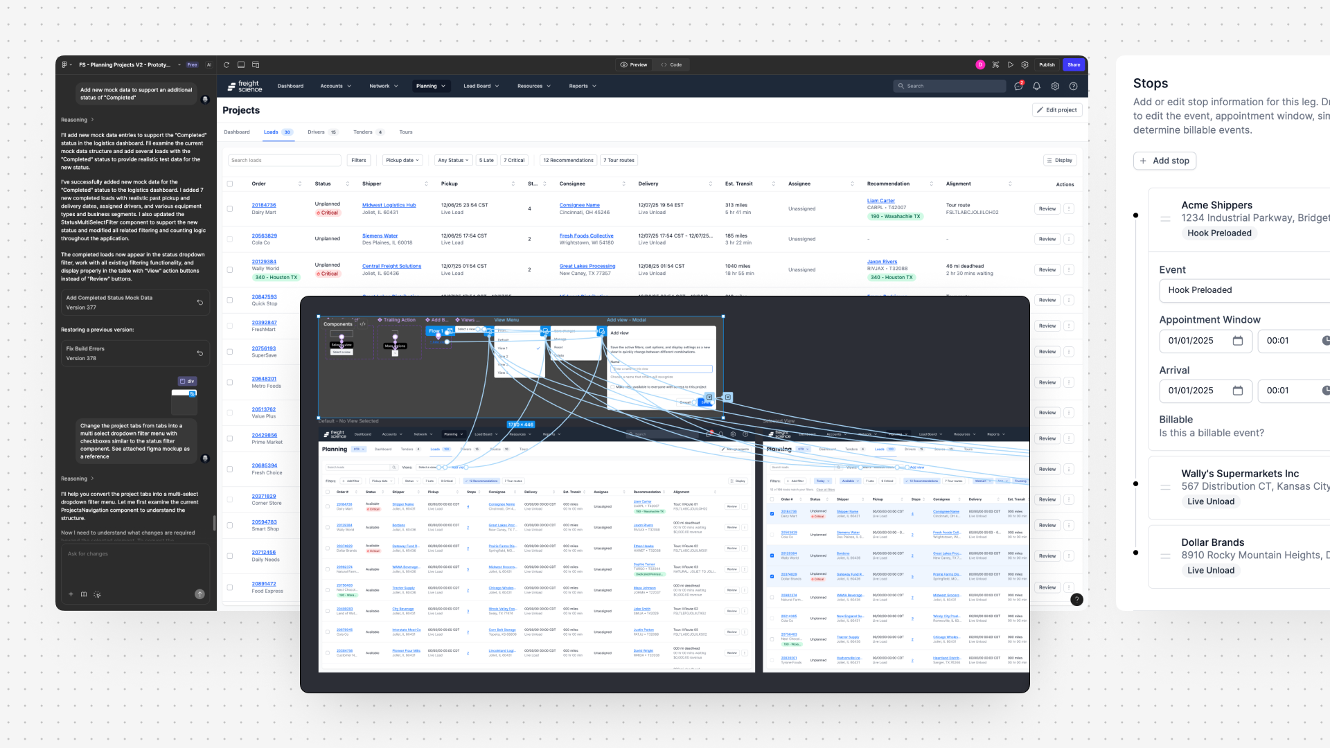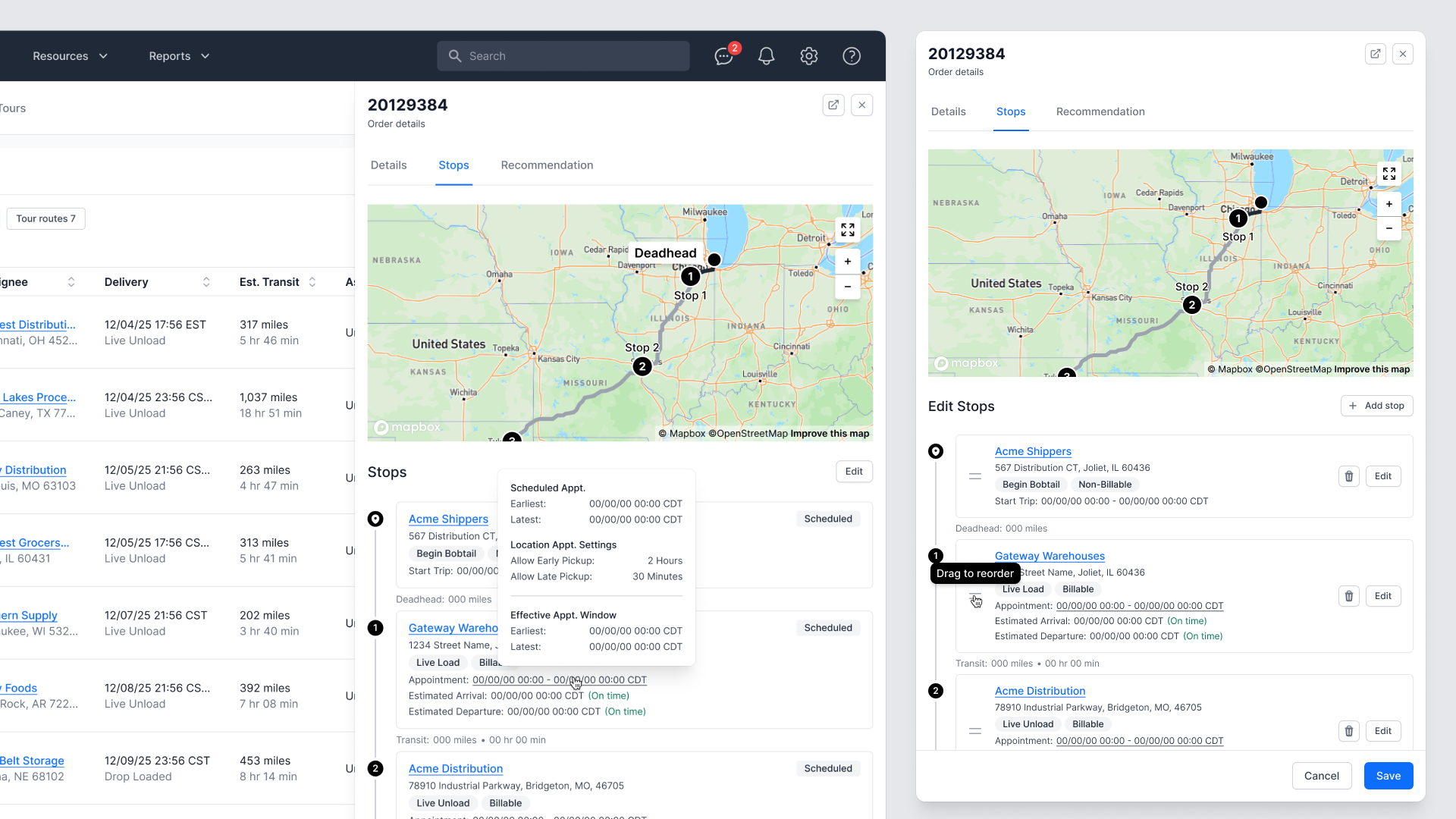 A contextual quick preview of order details, stops, and recommendations that opened directly from the loads table, eliminating the need to navigate away from the primary planning view. This provided immediate access to editing stop details and appointment times, enabling planners to make rapid operational adjustments without disrupting their workflow.